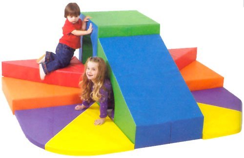 Designed for little mountain climbers, 24 months thru toddler 4s. Children will find this 30" high unique wall climber successfully challenging. Mountain scaling this big soft climber will delight every child, and develop gross motor skills and spatial relationships while crawling through the tunnels. Tiered steps up, a big slide down, and a big tunnel for exploring. Children will love these enormous scale climbers - Just like a giant set of building blocks. Takes a 54" x 80" space.